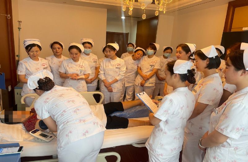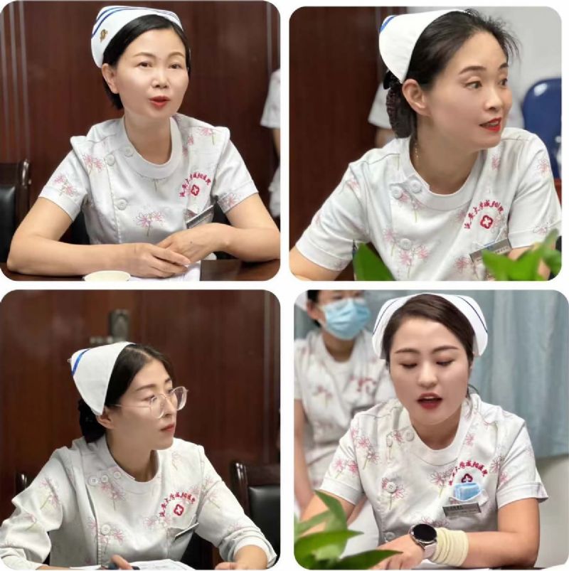 崔琳护士长根据2023年中华护理学会团体标准《住院患者静脉血栓栓塞症预防护理与管理专家共识》和《周围血管血栓性疾病置管溶栓护理专家共识》对术前患者是否可以进行踝泵运动和下肢周长测量方法进行讨论,并指导对患者术后下肢轻度水肿用硫酸镁湿敷:1/4硫酸镁粉剂+200ml水浸湿毛巾对患肢包裹,用保鲜膜包裹,每天3-5次,每次30min,补充了我们对此护理的不足。薛娜护士长从叙事的角度对护理宣教时机给予指导,并对苟美护士在护理过程中用叙事护理以患者为中心、尊重患者的故事、倾听和理解等方面对患者的精心护理给予好评和肯定。在查房过程中,护理团队针对患者的病情和护理也展开了热烈的讨论。大家各抒己见,提出了许多宝贵的建议和改进措施。例如,徐莉护士长提出及时指导卧床患者腹式呼吸,锻炼患者心肺功能:殷本玲护士长指出对术后患者指导穿脱弹力袜、使用医疗弹力绷带等问题给予指导。 党文婷总护士长对本次查房进行了总结和点评,充分肯定了护理团队的工作,并强调了护理工作中细节的重要性。护理过程中要重视患者的心理护理,表扬责任护士苟美的进步,表明把病人的需求作为中心点,有技巧的对患者进行宣教,健康宣教知晓率一定会有所提升,为患者提供更加全面、个性化的护理服务。