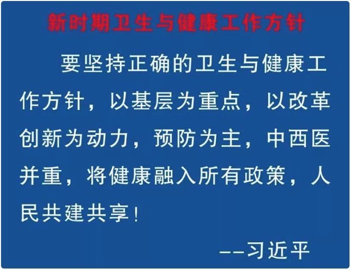 《健康中国2030规划纲要》明确新时期卫生与健康工作方针,俗称38字卫生方针,“以基层为重点,以改革创新为动力,预防为主,中西医并重,将健康融入所有政策,人民共建共享。”