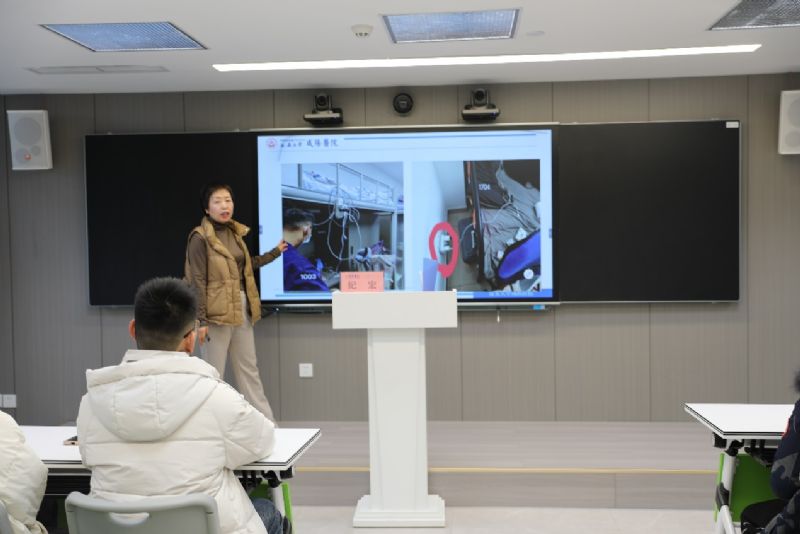 最后,宿舍管理员纪宏老师从“制度、卫生、安全、应急”四个维度进行住宿规范培训。明确作息时间、访客登记等管理细则,强调违规电器使用禁令,演示消防器材操作方法,并建立24小时应急响应机制。通过构建“制度约束+自主管理”双模式,着力为见习生打造安全、整洁、和谐的生活学习环境。