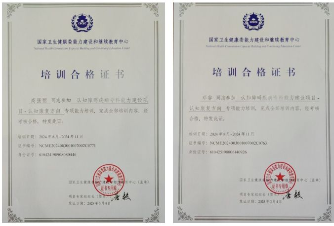 在认知障碍疾病诊疗领域不断探索前行的征程中,我院又迎来一则振奋人心的喜讯!我院脑血管病院高强丽同志和邓睿同志经过不懈努力,成功取得国家卫健委能力建设和继续教育中心认知障碍疾病专科能力建设项目-认知康复方向专项能力培训合格证书。这一成果的取得,不仅是两位同志个人专业成长道路上的重要里程碑,更是我院在认知障碍疾病诊疗体系建设进程中的又一有力见证。