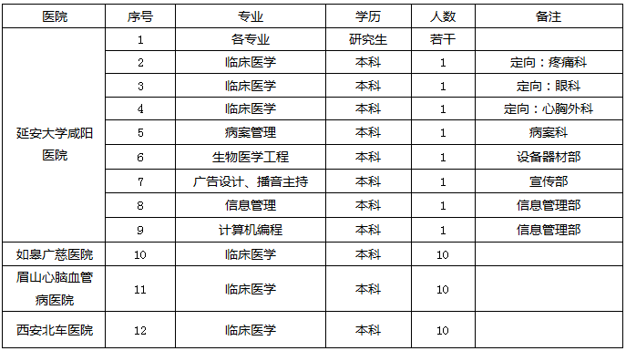 根据医院发展需要,延安大学咸阳医院现面向社会招聘各专业医师若干,具体要求如下: