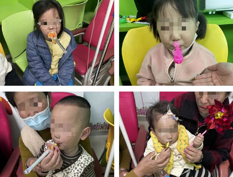 除了这些游戏,护士们还将专业的呼吸训练动作教与家长及孩子们,让孩子们跟着一边玩着,一边做练习,在轻松愉悦的氛围中完成了呼吸训练。