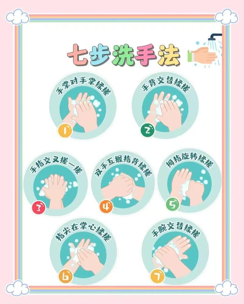 手卫生:预防诺如病毒感染的关键措施。饭前便后要用肥皂或洗手液,按照“七步法”,用流动水充分洗手,揉搓时间不少于20秒 ,确保双手各个部位都能清洁到位。