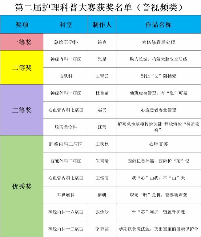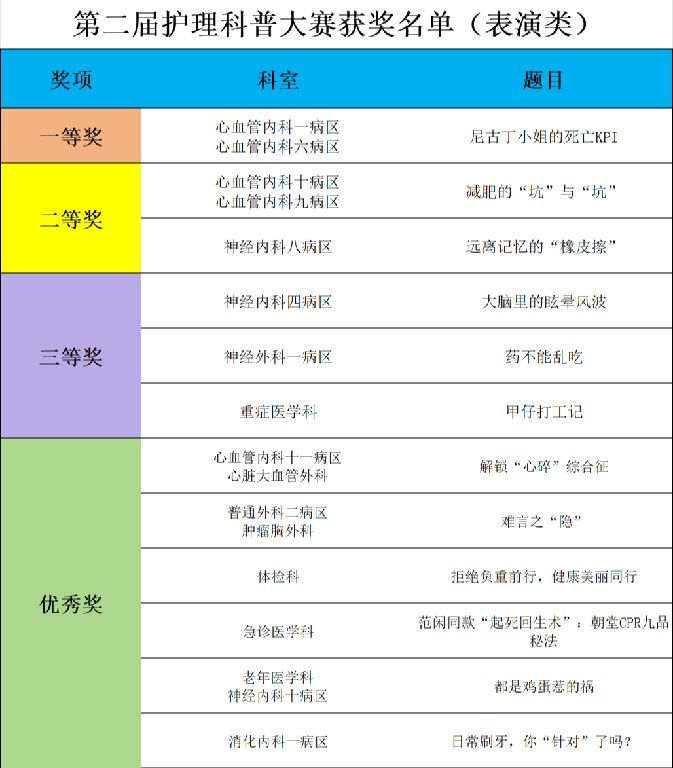 经过评委从科普内容、表现形式、科普效果等多个维度,对参赛作品进行全面细致的评估,最终评选出表演类和音视频类一等奖各1名、二等奖各2名、三等奖各3名、优秀奖各6名,护理科普管理委员会主任委员、脑科病院宋春兰总护士长宣读比赛结果并组织了隆重的颁奖仪式。