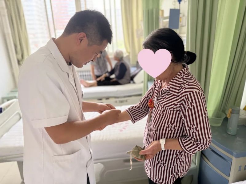 马静静主管护师面带微笑,将热气腾腾的粽子送到患者面前,轻声说道:“端午节快到了,这是我们的一点心意,祝您端午安康,早日康复!”朴实的话语,传递着最真挚的祝福。