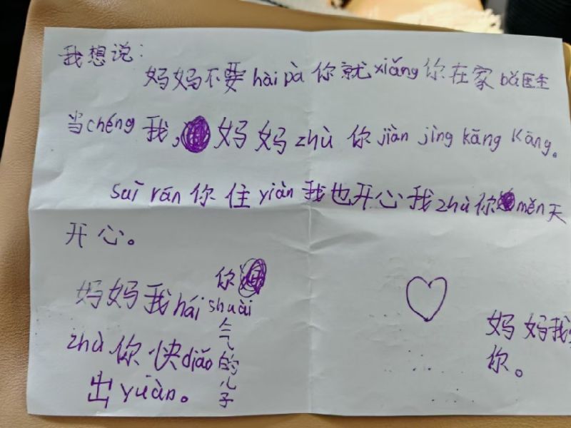 瑶瑶:“工作中我一直勤勤恳恳,认真负责,对待每位患者都热情周到服务,用真诚与热情温暖着每一位患者的心。面对行动不便的患者,会主动上前搀扶,遇到情绪焦虑的患者,会停下手中的工作,用专业知识和温暖话语安抚化解患者的不安。经常受到领导与家属的好评。生活中由于工作原因没有太多时间陪我儿子,但是我会让儿子感到不管我在哪里都很爱他,我会经常对他说妈妈爱你,出门的时候会抱抱他,他现在已经7岁了,我还是会这样做。小的时候只要有时间我都会给他讲绘本故事,每次不管多累都会陪他干他想干的事,下夜班回家他都不会打扰我,真的是个很暖、很省心的孩子。还有就是家里人的支持,一个有爱的家庭氛围也是很重要的。这次生病后让我收获家人满满的爱。”这时她拿出手机让我看孩子给她写的信,读着读着瑶瑶突然趴到我的肩膀失声痛哭起来。