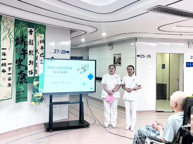 (一)科普讲堂王护士为大家讲解康复小知识。患者及家属都学习到了呼吸训练(腹式呼吸、缩唇呼吸)及有效咳嗽的方法。