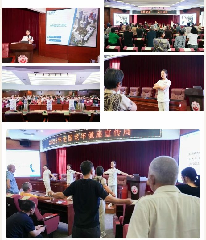 随后,中医护理专业组委员、中医脑病科雷静主管护师紧扣老年健康热点,以老年患者高血压管理为主题展开专题分享。她结合临床经验,从高血压的发病机制、隐匿症状、潜在危害切入,用生活化语言将专业知识转化为"听得懂、记得住"的健康指南,特别针对老年群体特点,细致讲解饮食控盐技巧、运动强度选择、用药依从性管理等实用要点。讲解结束后,雷静老师化身"健康教练",现场示范降压操。在雷静老师的带领下,现场老年朋友们逐渐掌握了颈部拉伸、手腕转动等降压操核心动作,现场不时响起相互鼓励的欢笑声。这场理论与实践结合的科普活动,不仅让老人们收获了科学管理高血压的方法,更在轻松互动中增强了健康管理意识。
