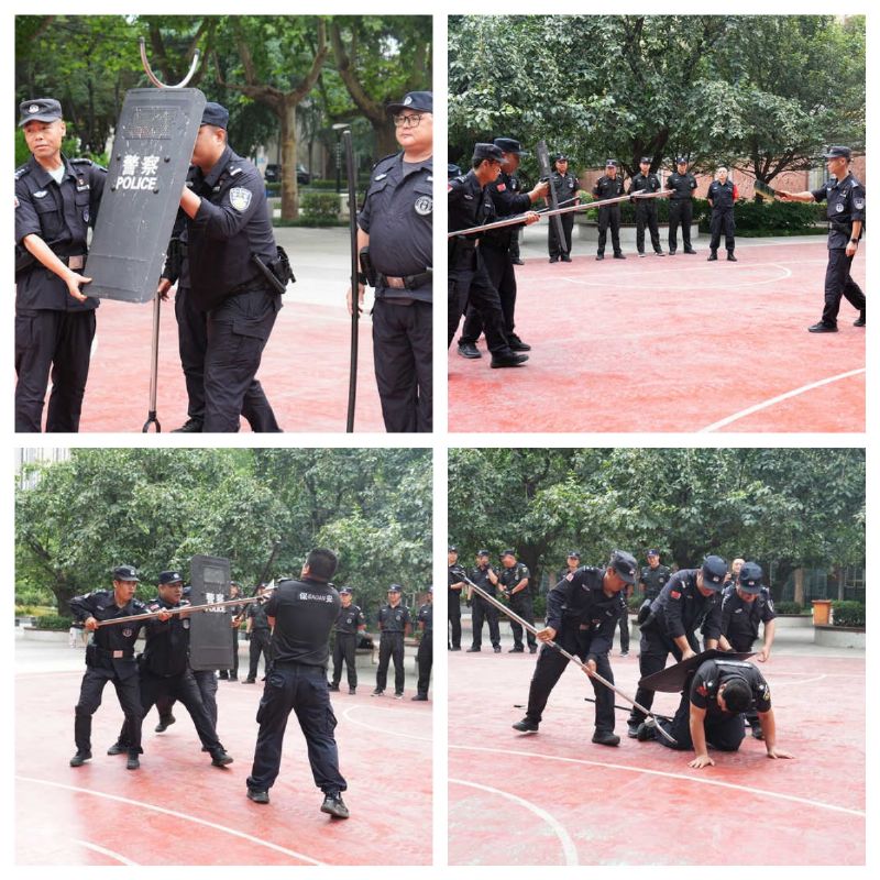随后,为了让保安员们能够将理论知识转化为实际操作能力,巡特警大队教导员吴海和四名巡特警教官现场演示防暴实战技能;教官们对各类防暴器材的使用方法和技巧进行了现场演示,包括警棍、盾牌、钢叉等常见装备的正确握持、攻击和防御姿势,按照演示保安员们分组进行了模拟实战演练。