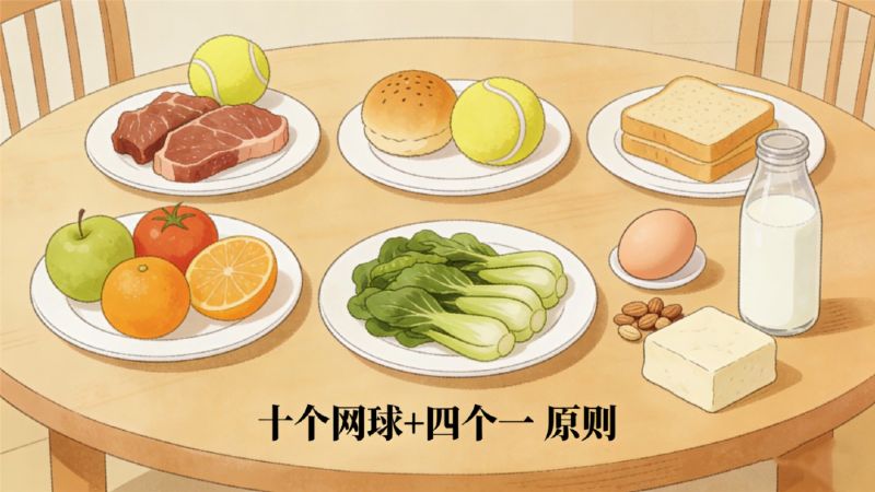 3. 吃饭跟着“口诀”来:遵循“十个网球+四个一”原则:肉类不超1个网球量,主食2个网球,水果3个网球,素菜不少于4个网球;每天1个鸡蛋、1斤牛奶、1把小坚果、1块扑克牌大小的豆腐;少放盐、少油炸,多喝温水,每天不少于1500ml;