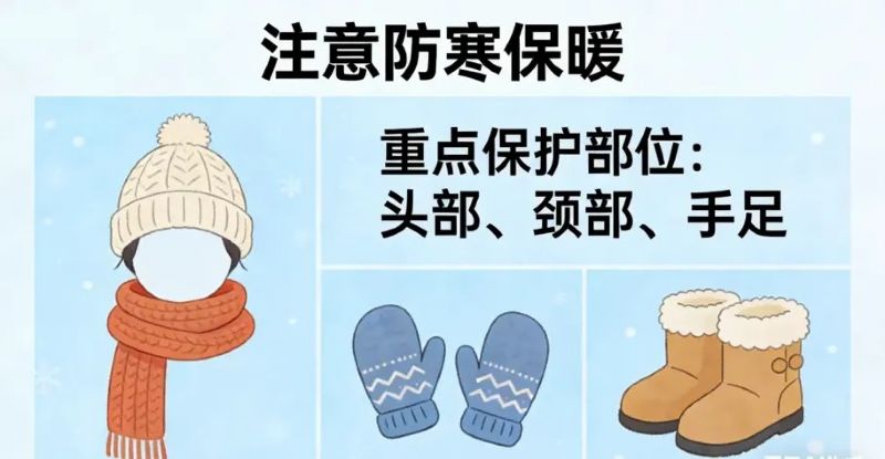 - 重点保护头颈部、手足等部位,这些地方血管丰富且位置表浅,容易受冷刺激;