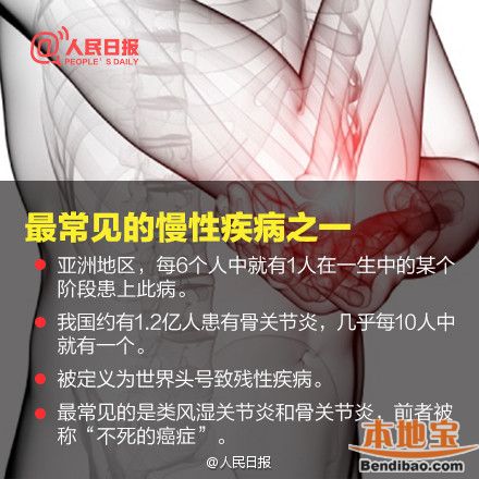 10月12日是世界关节炎日,今年的主题是保护关节,从年轻开始!目前全世界关节炎患者有3.55亿人。在亚洲地区,每六个人中就有一人在一生的某个阶段患上关节炎这种世界头号致残性疾病。目前估计中国大陆的关节炎病人有1亿以上,而且人数还在不断增加。