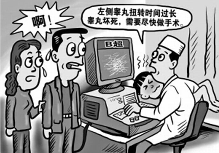 今年8月的一天,一位20岁的男青年在凌晨5时许,左侧阴囊突然绞痛,同时伴有左下腹痛、恶心呕吐;并在左腹股沟下方出现了一块肿物,逐渐增大急诊收入我院泌尿外科。医生检查时发现左腹股沟下有一4×4cm大小的肿块,压痛明显,质地较硬。左侧阴囊内无睾丸,阴囊皮肤无红肿。询问病史,该青年以往双侧阴囊均有睾丸,现在只有右侧阴囊内有。医生检查后诊断为“左侧睾丸扭转”,进行了急症手术,术中发现左侧睾丸已坏死,不得不予以切除。