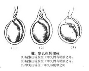 睾丸扭转(torsion of testis)又称精索扭转,由于剧烈运动或暴力损伤阴囊时,螺旋状附着于精索上的提睾肌强烈收缩,导致扭转并引起睾丸的急性血液循环障碍。临床并不罕见,往往发生于先天性睾丸系膜过长、睾丸引带发育不良、隐睾、睾丸下降不全、附睾与睾丸连接不完全、附睾与部分精索过度活动、精索过长等情况。常分为鞘膜内型和鞘膜外型两种。睾丸扭转方向多由外向内。而扭转发生在睾丸和附睾之间的情况则很少见。