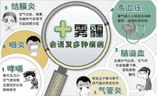 雾霾天气时雾霾颗粒会刺激呼吸道,出现咳嗽、闷气、呼吸不畅等,极易诱发包括支气管哮喘、支气管炎、过敏性鼻炎和变异性咳嗽等。有环保专家分析,灰霾很可能取代吸烟成为肺癌头号致病“杀手”。