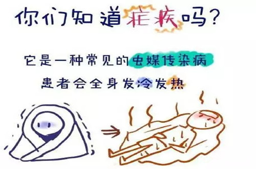 疟疾根据发作周期可分为间日症、恶性症和三日疟三种。得了疟疾以后最主要的症状是"发冷",并且发抖得很厉害,这在医学上叫做"寒战",大约持续几分钟左右就开始发高烧了,热度可以高达40℃,大约经过了3~4小时以后就出大汗,体温逐渐下降到正常。除了发冷、发烧以外,病人常常感到无力、疲乏、不想吃东西,头晕、背部四肢酸困。若是小孩,有时可出现抽风。重症疟疾病人,可见昏迷、谵语、脖硬、危及生命。