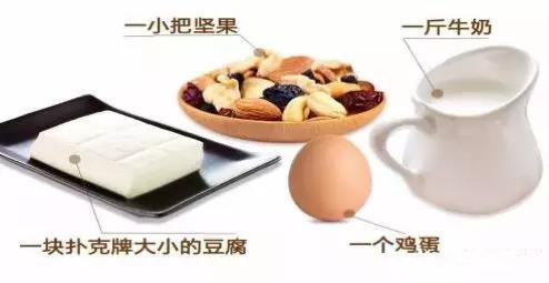 除了吃够"十个网球",人们每天应该摄入"四个一"一个鸡蛋、一斤牛奶、一小把坚果和一块扑克牌大小的豆腐。