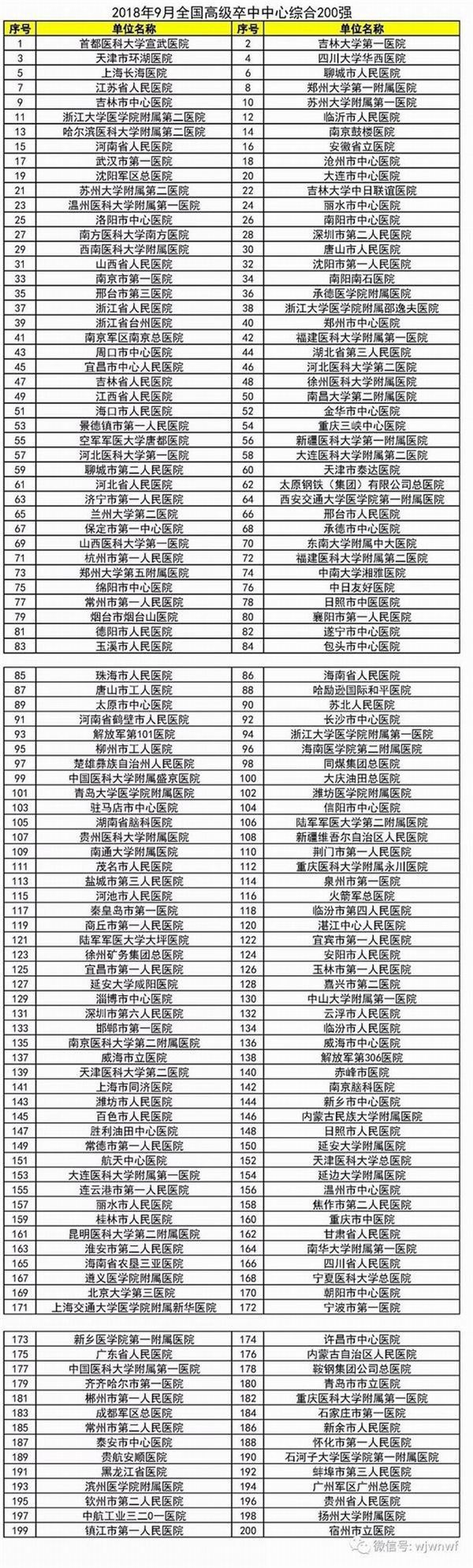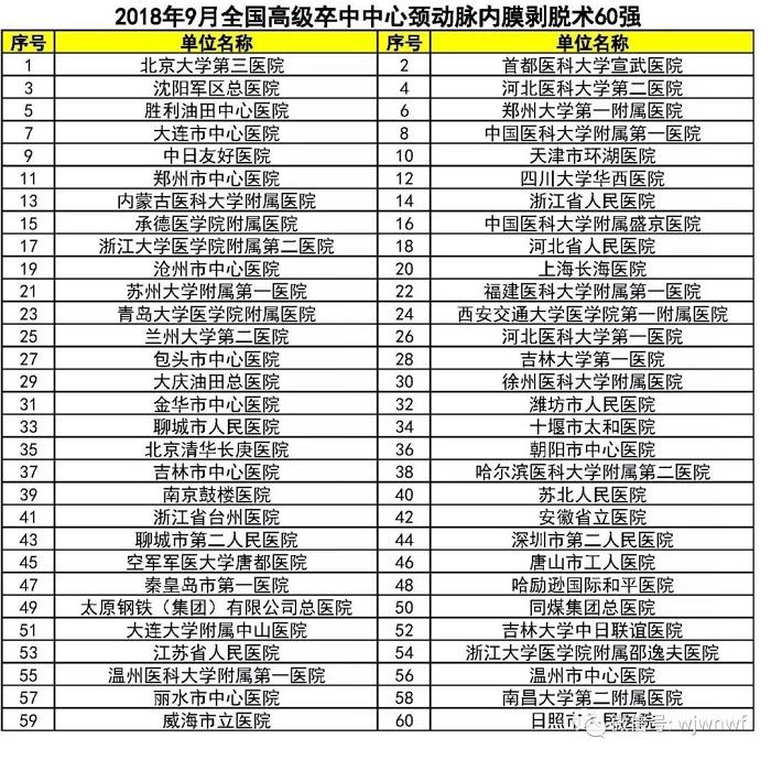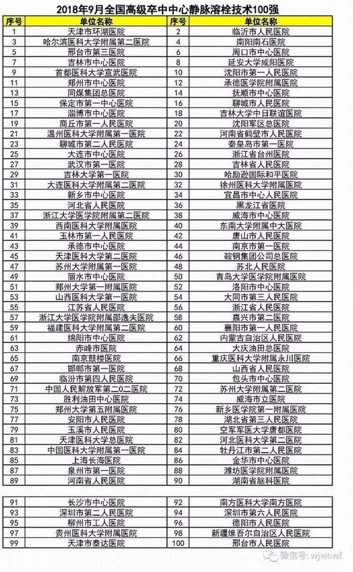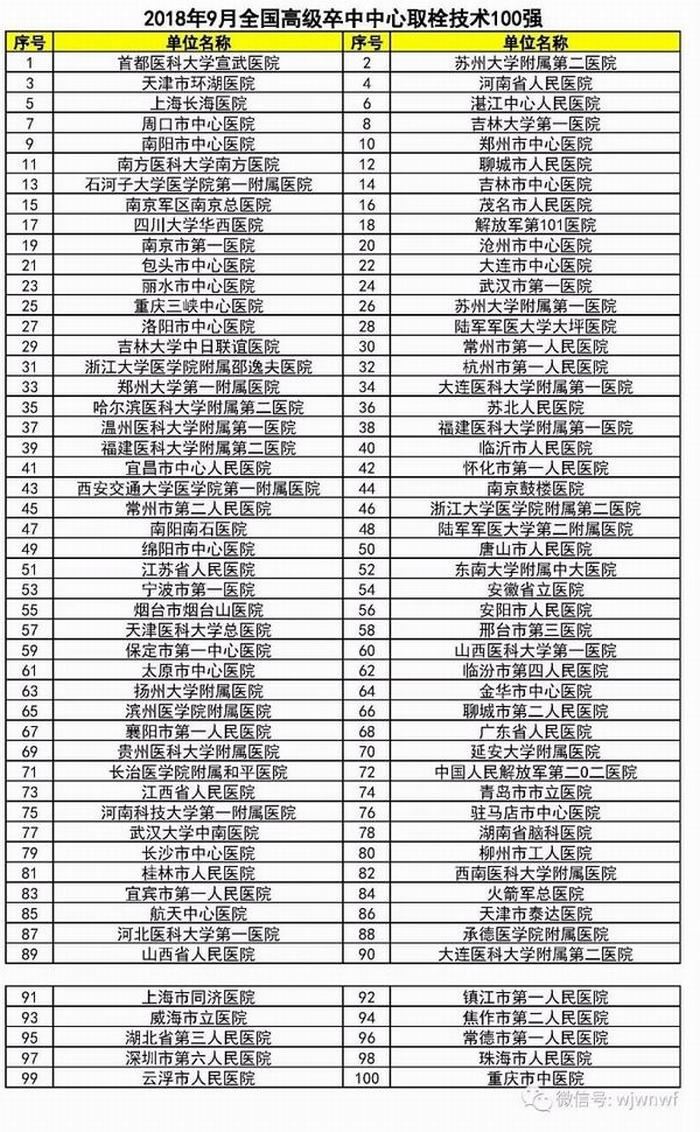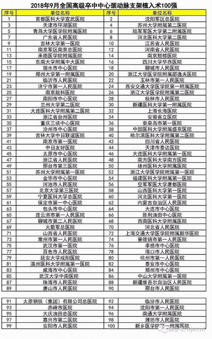 全国高级卒中中心百强医院名单(2018年9月)