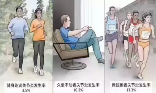 2017年美国《骨科与运动物理治疗杂志》(JOSPT)发表论文(Meta分析)指出,竞技跑步者的关节炎发生率为13.3%,久坐不动人群的关节炎发生率为10.2%,而健身跑步者的关节炎发生率仅为3.5%。因此大数据显示长时间的大宗随访研究结果是:过量和高强度的跑步可能会引发关节问题,但对于普通健身跑步的人来说,跑步是有利于关节健康的。