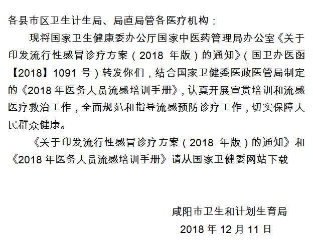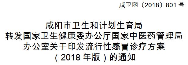 咸阳市卫生和计划生育局转发国家卫生健康委办公厅国家中医药管理局办公室关于印发流行性感冒诊疗方案(2018年版)的通知