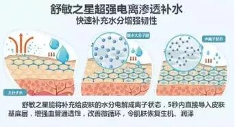 舒敏之星能将补充给皮肤的水分电离成离子状态,并通过同极离子相斥的作用原理,将离子水在5秒内直接导入到皮肤的基底层,为干燥肌肤提供了补水、输水、锁水,达到重建皮肤水环境目的。