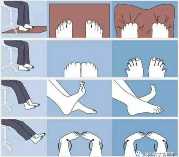 足尖运动:坐立,将双脚脚尖着地,尽量与脚踝保持水平,以脚尖为支点带动足部向后上下移动10至15次。