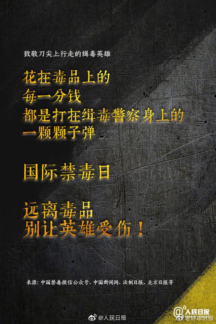和平年代,禁毒被视为牺牲最大、最惨烈的战争。为了打赢这场战争,无数缉毒警察不仅时刻面临牺牲家庭和身体健康的风险,还可能奉献自己的生命。请记住:花在毒品上的每一分钱,都是打在缉毒警察身上的一颗颗子弹。今天,国际禁毒日,远离毒品。
