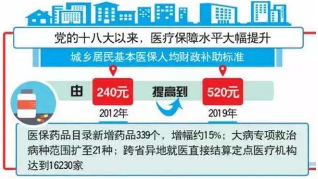 在制度指引下,医改结出累累硕果,医疗保障水平大幅提升,城乡居民基本医保人均财政补助标准由2012年的240元提高到2019年的520元;医保药品目录新增药品339个,增幅约15%;大病专项救治病种范围扩至21种;跨省异地就医直接结算定点医疗机构达到16230家。
