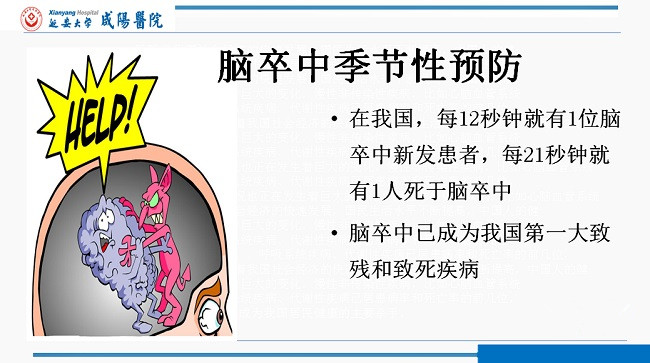2019年10月29日是第14个“世界卒中日”,宣传主题是“预防为主,远离卒中”,口号为“远离卒中,从健康生活开始。