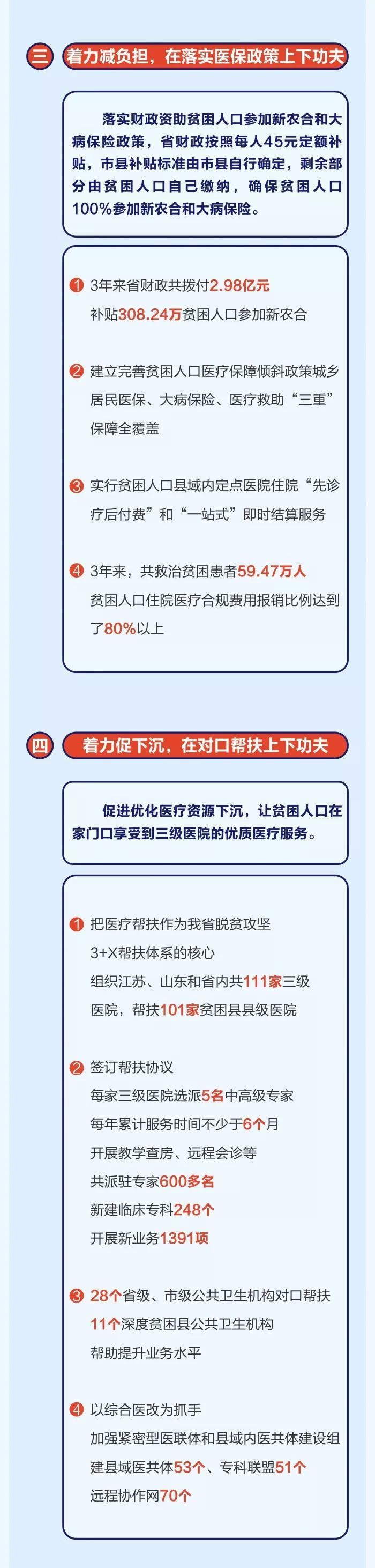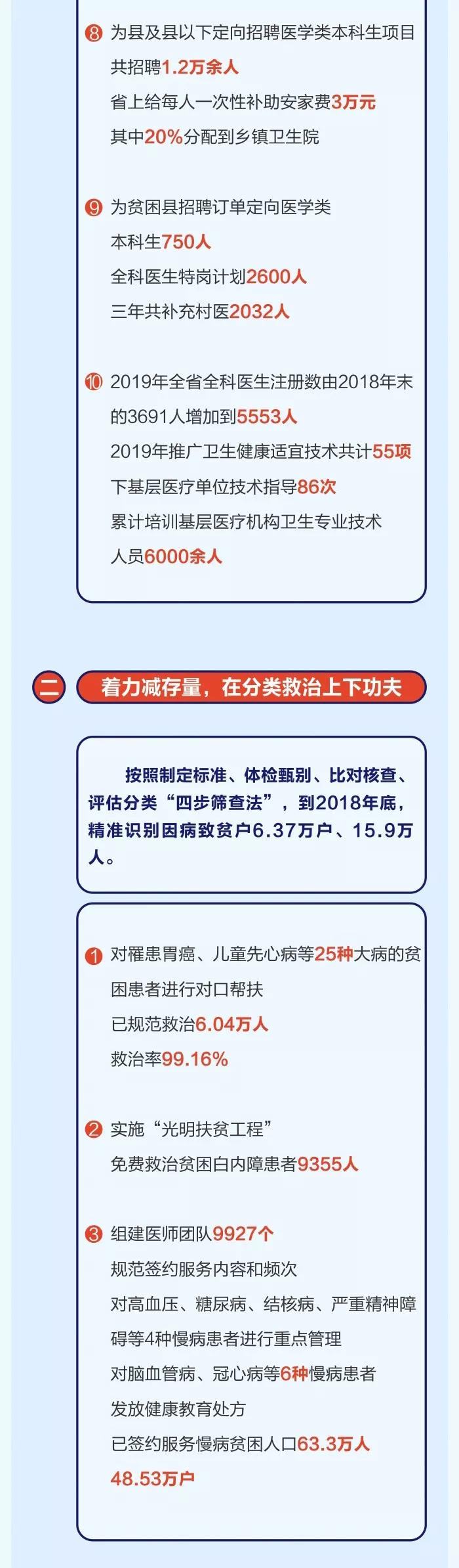 2017年以来,全省各级卫生健康部门认真学习领会习近平总书记关于扶贫工作的重要论述,坚决贯彻落实中央和省委、省政府脱贫攻坚决策部署,把健康扶贫作为卫生健康工作的重大政治任务、重点民生工程和重要发展机遇,以基本医疗有保障为目标,坚持“两手抓”工作思路(一手抓精准施治减存量、一手抓疾病预防控增量),尽锐出战,攻坚克难,健康扶贫工作取得显著成效,因病致贫户较2016年减少13.83万户,为全省脱贫攻坚作出了重要贡献。