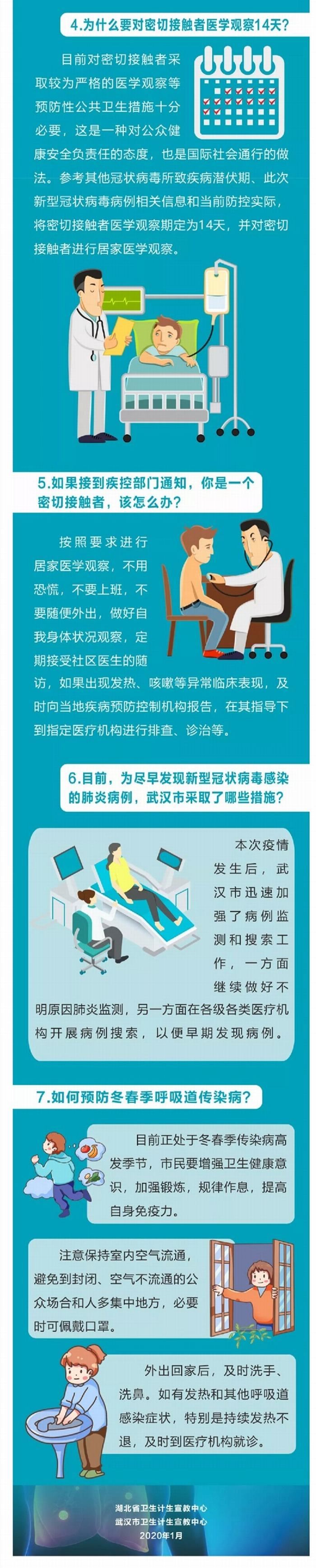 4、预防:传染源和易感人群无法改变,只有从传播途径上想办法。作为普通人,远离传染源是最好的预防。具体:1.远离医院(发病人群最集中的地方就是医院了,尤其急诊科、发热门诊、呼吸内科);2尽量远离人多且密闭的环境如超市商场生鲜市场饭店等;3.尽量避免乘坐地铁公交车等密闭人多的交通工具;4.保持基本的手卫生和呼吸道卫生,勤洗手,避免和有发热咳嗽打喷嚏的人密切接触,对于不可避免要出现在前述场景时,戴一次性外科口罩(至少两层)或者N95口罩,一次性口罩最长4小时就需更换,或被水汽浸湿失去防护效果时也需要更换。5.出门注意防护,戴口罩。尽量手不要摸脸、不要揉眼睛、不要直接拿食物。回家时洗头、洗澡、洗衣服,羽绒服之类不方便每天洗的,可以挂阳台大风吹。开车的到家前,提前开全部车窗10分钟大风吹。6.另,疫苗不要想了,新发现的病毒,从疫苗研发到量产要数年时间。