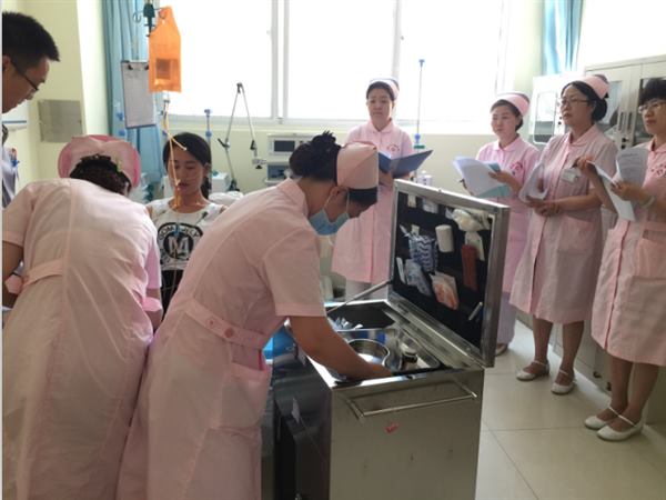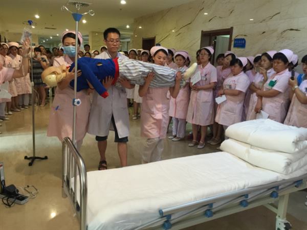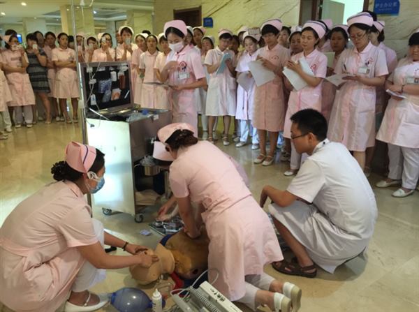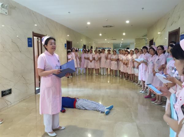 此次演练是为检验我院护理管理体系的应急指挥协调能力、护理人员急危重症护理综合能力、急救仪器设备性能状态。演练过程按既定方案进行,模拟心脏急诊/胸痛中心在短时间内接诊2名急危重症患者,造成护理人员紧缺,急需调配人员支援。 一阵紧促的电话铃声响起,急诊科的护士送一位急性左心功能衰竭患者至抢救室,在医生护士的紧密合作下,深大急促的呼吸渐趋平稳、慌乱的心跳逐渐恢复中。突然出现一阵恐慌声“医生、护士,有人昏倒在走廊”,在心脏急诊/胸痛中心人员紧张情况下,李静护士长即刻组织科室人员对走廊昏迷患者进行抢救,并立即打电话通知护理部调派人员参与抢救。3分钟后,增派人员达到,共同对患者进行抢救。经过积极的抢救,患者复苏成功,继续给予高级生命支持,并通知家属。所有护士长、护理骨干、轮转护士等八十余人,在现场观摩了“事件报告、启动方案、现场抢救、患者疏散、三人搬运法、复苏后的后续工作”等重要环节,清晰、全面了解了突发事件发生时护理人力资源调配流程。