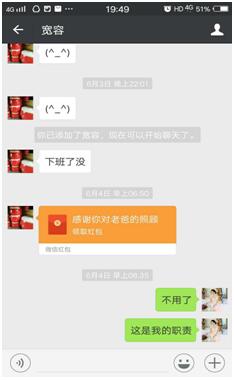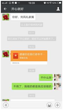 赵阿娟曾经护理过一位病人,因为细心的护理和照料,家属对她感激不已,两位家属先后希望以微信红包的方式表达他们的感谢:“阿娟,老爷子在病重期间得到你悉心的照料,老人特别感激你,经常对我们说要好好感谢你。现在老人走了,我们替老人完成他未了的心愿,以表达我们的感激之情。钱不多,可这是我们全家的心意,请收下红包,不要让老人心里有遗憾。本来想给孩子买点吃的,但是不方便给你。如果你不领红包,我们心里会很难过。”