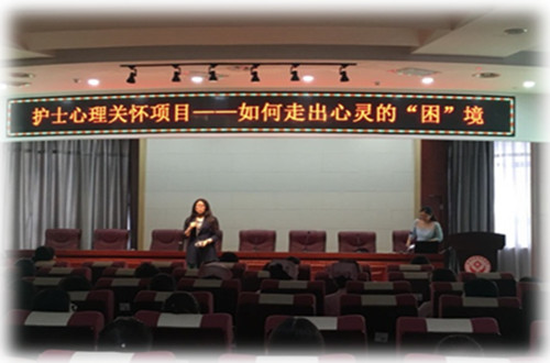 关注患者,更关注护士,在当前的医疗环境下,护士的工作压力越来越大,为了缓解护士的心理压力,树立“快乐工作,快乐生活”的信念,延安大学咸阳医院护理部2018年启动了护士心理关怀项目,2018年5月15日下午,以“ 如何走出心灵的‘困’境 ”为主题的心理讲座在延安大学咸阳医院脑科楼三楼会议室举行。这是近一年来的第三次心理讲座,也是5.12国际护士节的系列活动之一。本次活动邀请到了国家二级心理咨询师、咸阳市心理健康教育研究会杨春荣理事,参加本次讲座的还有护理部杨敏主任,各系统总护士长及有心理疏导需求各个科室护士。为了使疏导有针对性,护理部前期特意发放了护士压力源调查问卷,本次讲座以调查中排名靠前的五个问题展开,从“现实世界”走进“心理世界”与护士进行了一次心灵深处的对话。
