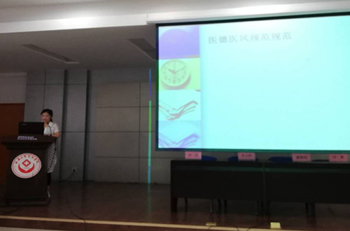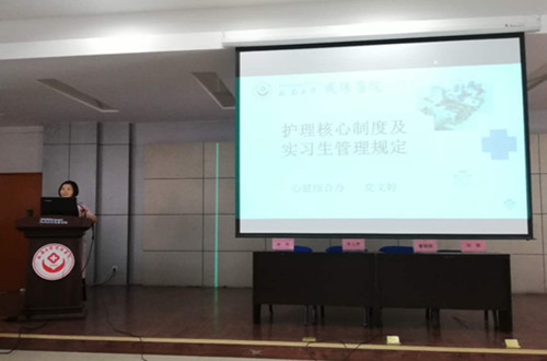 党文婷总护士长就《实习生管理规定及相关护理核心制度》分别从法律法规、我院护理核心制度、实习生要求及规范、请假管理规定等方面进行讲解,要求同学们严格执行护理核心制度,认真遵守医院相关规定;护理部奉明老师从《护士执业礼仪与医德医风规范》中教会大家如何成为一名讲文明、懂礼貌、有内涵、高素质的优秀护士;罗建利护士长针对《护患沟通技巧》阐述了护患沟通的方法、技巧、时机,指导大家在今后的临床工作中如何实施有效的护患沟通;董朝妮护士长对于《如何更好的进行临床护理实习》结合自身工作学习经验,教会大家在有限的时间内学到更多的知识,为今后走上护理岗位奠定基础;刘敏护士长从《护理工作安全隐患》中围绕患者十大安全目标,重点对护理实习生在实习过程中易出现的问题、防范措施等方面进行讲解。