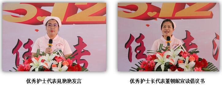 我院优秀护士代表晁艳艳发言,表示不负荣誉、再接再厉,为医院护理工作再做贡献。优秀护士长代表董朝妮发出倡议,以患者为中心,用心、用情、用专业态度完成每一项工作,确保患者的安全;探索延续护理服务模式,做好慢性病患者的健康管理。