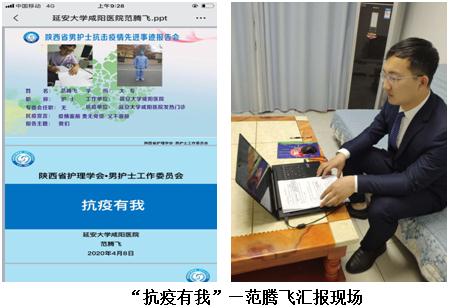 报告会由陕西省护理学会男护工作委员会主任委员何乾峰主持,共分为开幕式、抗击疫情先进事迹报告、闭幕式三个部分。来自陕西省各级医院的14位抗疫战士在报告会上生动的讲述了自己在前线与疫情战斗的历程与收获,我院精神科男护士范腾飞的报告主题是“我们”,他讲述了自己有幸穿上防护服,作为一线战士坚守在我院特殊发热门诊抗击疫情的经历,并且通过参加此次抗疫更加坚定了自己的职业理想与信念。范腾飞在报告中说:职业的价值感要靠自己去努力创造,在男护士这条职业道路上,他将与众多前辈和“战友”一起大步向前,闪烁出属于男护士的璀璨光芒”。范腾飞的报告受到多名在线观众的点赞称好。