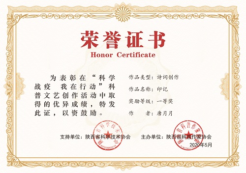 五月,柳丝在暖风里摇摇晃晃,悄然漫过初夏的河堤。摇曳的春风捎来喜讯、送来捷报,我院在比赛中荣获优秀组织奖,选送的作品中神经内科VIP一病区唐月月创作的诗词《印记》荣获一等奖、手术室胡兴军创作的小小说《小冠和他的伙伴们》荣获二等奖、呼吸内科常美琪创作的诗词《致敬!最美逆行者!》荣获优秀奖。