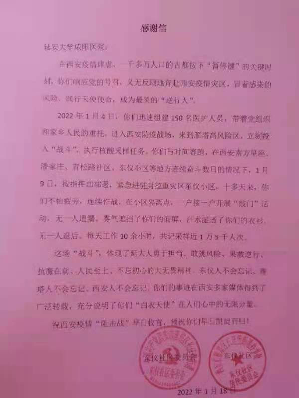 2022年1月18日——支援西安的第15天。延安大学咸阳医院收到来自中国共产党西安市雁塔区长延堡街道东仪社区委员会的感谢信。信中写到:这场“战斗”体现了延大人“勇于担当、敢挑风险、果断逆行、抗魔在前、人民至上、不忘初心”的大无畏精神。