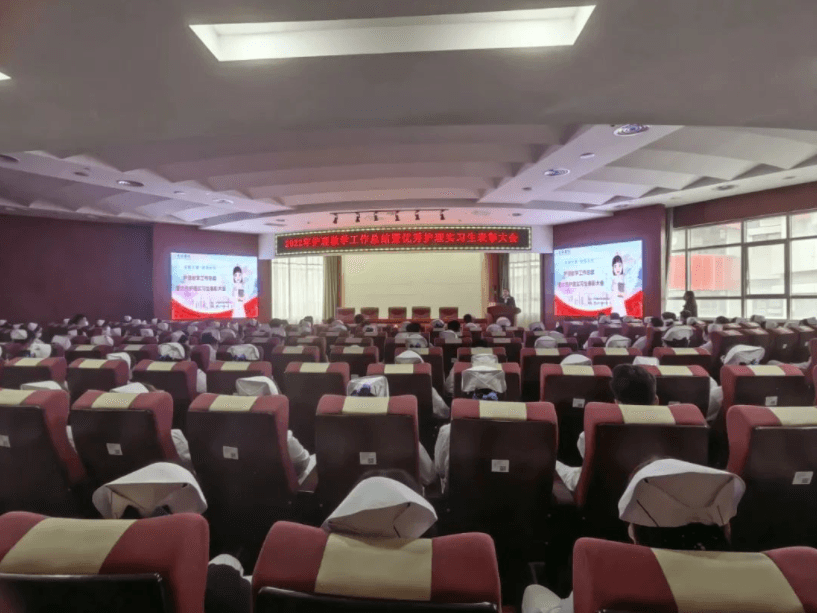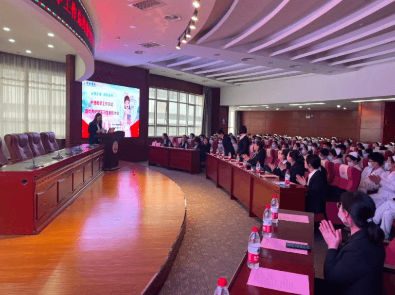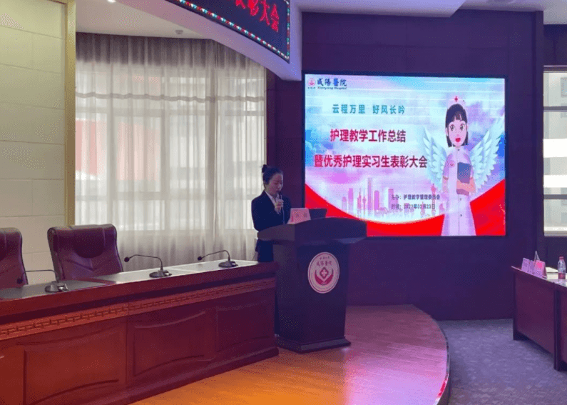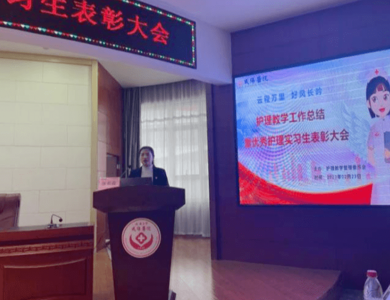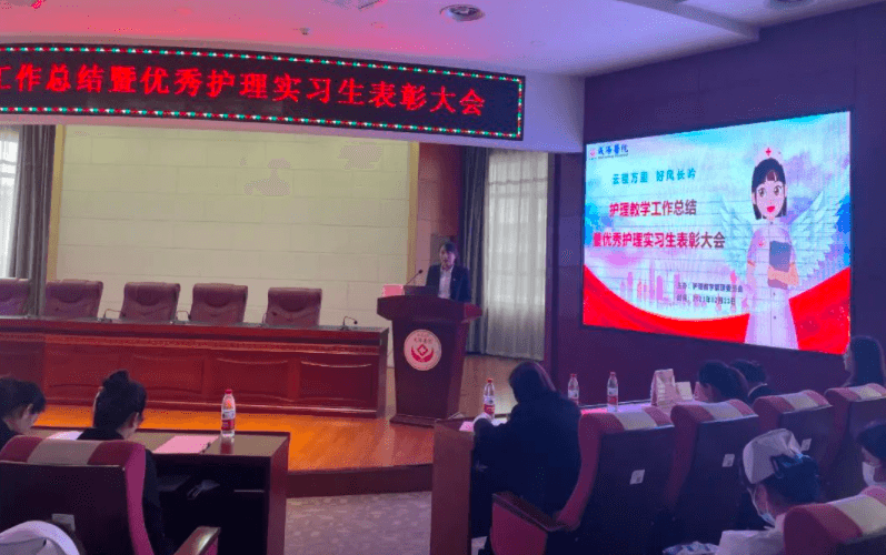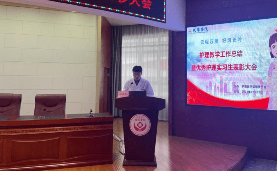 2023年2月23日下午两点,延安大学咸阳医院护理教学管理委员会在脑血管病院第三学术厅召开了“2022年度教学工作总结暨优秀护理实习生表彰大会”,本次会议由教学干事孙姣姣主持,杨敏院长助理、党文婷总护士长、教学管理委员会全体成员及在院的200名护理实习生参加本次会议。