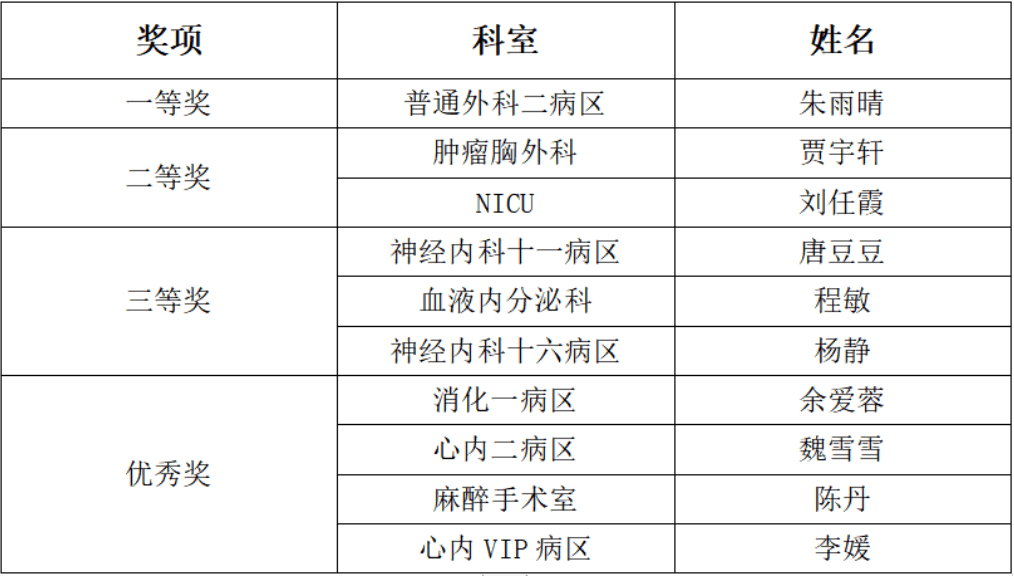 本次比赛经过前期筹备、层层筛选,共有十名选手进入决赛。选手们以亲身历经的临床案例为切入点,通过对标指南与专家共识,从实用性、科学性、严谨性、前沿性出发,结合医院在护理实践、教学培训、质量管理等方面工作中取得的成绩,分别从"专科特点""风险控制""质量改善"等多个角度进行选题设计。凭借稳健的台风、精准的表达、生动的案例,充分展现了护士的专业魅力及职业的风采,赢得了现场观众及各评委们的阵阵掌声。经过激烈角逐,最终产生一等奖1名、二等奖2名、三等奖3名以及优秀奖4名(见附件)。