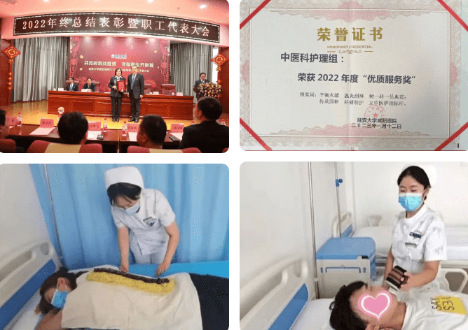 弘扬为引,传承为基。以中医特色专科护理理论为基础,不断探索中医特色护理的应用与创新。申报院内护理科研课题4项、新技术项目2项;发表论文9篇、公众号文章30余篇,科普宣传10余次。科室开展多项中医适宜技术,如平衡火罐、温灸刮痧、火龙灸、雷火灸、穴位注射、穴位贴敷、中药封包等。同时扎实开展“服务人性化,中医药特色化,护理整体化”的中医特色护理模式,秉承中医学整体观念和辩证施护的基本特点,深化“一科一品”优质护理服务内涵。积极发挥中医护理在疾病预防、治疗、康复等方面的重要作用,根据季节、节气不同,有针对性地对患者进行生活与饮食等方面的指导。在护理团队的辛勤耕耘下,得到了广泛的肯定与信赖,中医科护理组荣获延安大学咸阳医院2022年度“优质服务奖”。