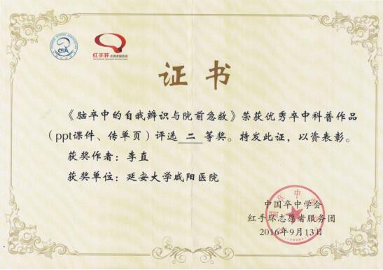 近日,从中国卒中学会红手环志愿者服务团传来喜讯,我院脑血管病院在中国卒中学会优秀卒中科普作品征集活动中表现出色,由神经内科贵宾病区李直医师创作的《脑卒中的自我辨识与院前急救》和《卒中的诱因与预防》分别荣获优秀卒中科普作品评选二等奖!