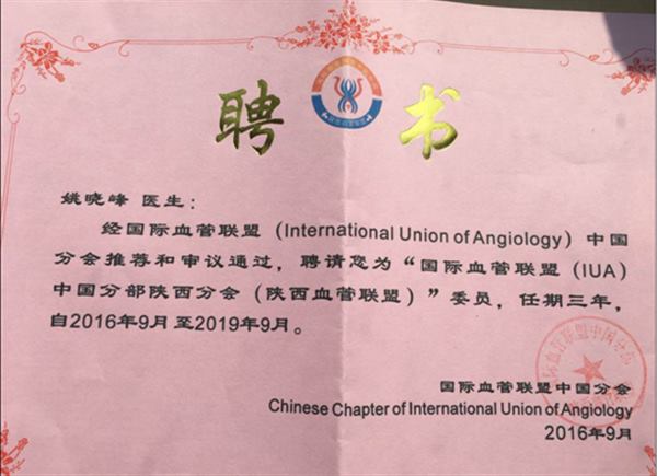 热烈祝贺我院姚晓峰副院长当选为国际血管联盟中国分部陕西分会委员