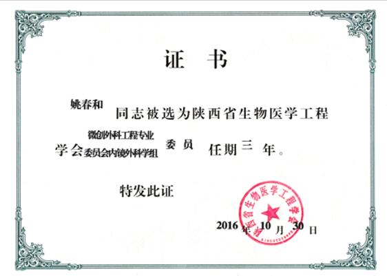 热烈祝贺我院姚春和主任当选为陕西省生物医学工程学会微创外科工程专业委员会内镜外科学组委员