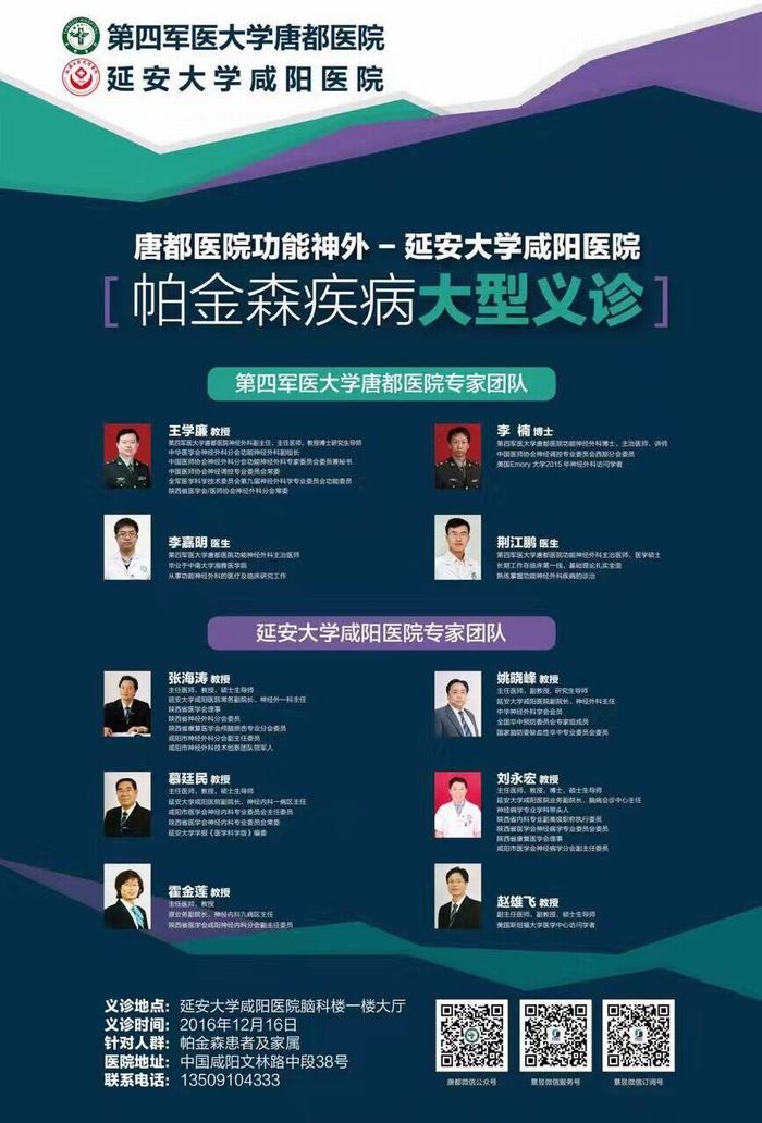 今年国际帕金森病日的主题是“综合治疗,品质生活”,为了帮助更多帕金森病患者更好地认识疾病、战胜疾病,12月16日,由我院脑血管病院、神经外科联合第四军医大学唐都医院神经外科将在我院脑血管病院一楼大厅举办帕金森病专场大型公益活动。