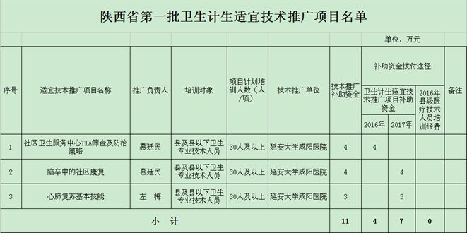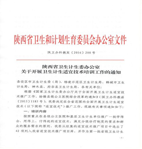 2016年12月5日,根据《陕西省卫生计生委办公室关于开展卫生计生适宜技术培训工作的通知》(陕卫办科教发【2016】200号)文件精神,我院慕廷民副院长领衔申报的项目《社区卫生服务中心TIA筛查及防治策略》、《脑卒中的社区康复》和心血管内科二病区左梅主任领衔申报的项目《心肺复苏基本技能》经陕西省卫计委审核评定,分别获批为陕西省第一批卫生计生适宜技术推广项目,获批经费总计达11万。本次全省共选出42个项目列入陕西省适宜技术推广项目库。