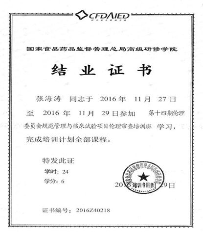 2016年11月27日,我院医学伦理委员会主任委员张海涛副院长受邀参加了国家食品药品监督管理总局高级研修学院在安徽省合肥市举办的第十四期伦理委员会规范管理与临床试验项目伦理审查培训班。