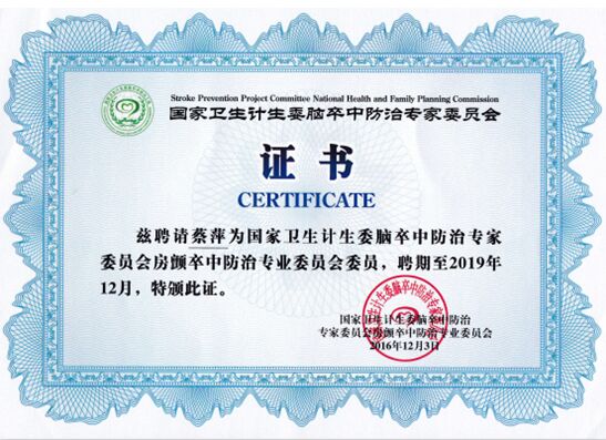 我院蔡萍同志获聘为国家卫生计生委脑卒中防治专家委员会房颤卒中防治专业委员会委员