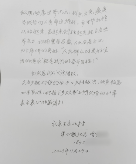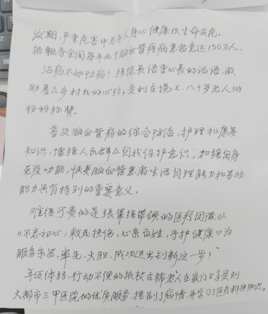 11月30日一大早,参加本次义诊的村民曹叔叔将一封感谢信送到了流动医院行政副院长张军强手中,并表示“感谢你们延安大学咸阳医院全体医护人员,普及脑血管病的综合防治、护理和康复知识,增强人民群众自我保护意识,加上自身免疫功能,恢复脑血管患者生活自理能力和劳动能力具有特别的重要意义,让年迈体弱,行动不便的依仗古稀老人在家门口享受到三甲医院的优质服务,控制了病情,并学习了医疗保健知识。”